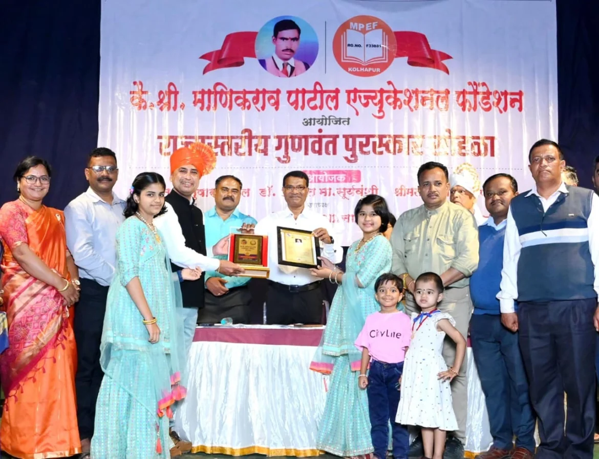 गडहिंग्लज प्रतिनिधी : स्व.माणिकराव पाटील एज्युकेशनल फाउंडेशन,कोल्हापूर आयोजित राज्यस्तरीय गुणवंत पुरस्कार सोहळा २०२५ शाहू स्मारक भवन,कोल्हापूर येथे संपन्न झाला. भादवण हायस्कूल,भादवणचे सहाय्यक शिक्षक प्रशांत सुभाष गुरव यांना वीस वर्षांच्या सेवेतील शैक्षणिक,सामाजिक,सांस्कृतिक, साहित्य,कला,क्रीडा अशा अष्टपैलू कार्याची नोंद घेऊन राज्यस्तरीय माणिक शिक्षण सेवा गौरव पुरस्कार 2025 ने सन्मानित करण्यात आले. सोहळ्याला प्रमुख पाहुणे म्हणून शिवाजी विद्यापीठ कोल्हापूरचे मराठी अधिविभाग प्रमुख डॉ.रणधीर शिंदे उपस्थित होते. कार्यक्रमाचे अध्यक्षस्थानी महाराष्ट्र राज्य माध्यमिक उच्च माध्यमिक शिक्षण मंडळ,कोल्हापूर विभागाचे सहसचिव डी.एस.पोवार उपस्थित होते.